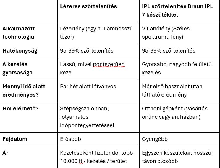 A két tartós szőrtelenítési módszer abban hasonlít egymásra, hogy fény segítségével célozza és semlegesíti a melanint, ugyanakkor működésükben és hatásukban jelentős eltérések vannak. Az alábbi táblázatban összegyűjtöttük a legfontosabb különbségeket és tudnivalókat a két eljárásról: